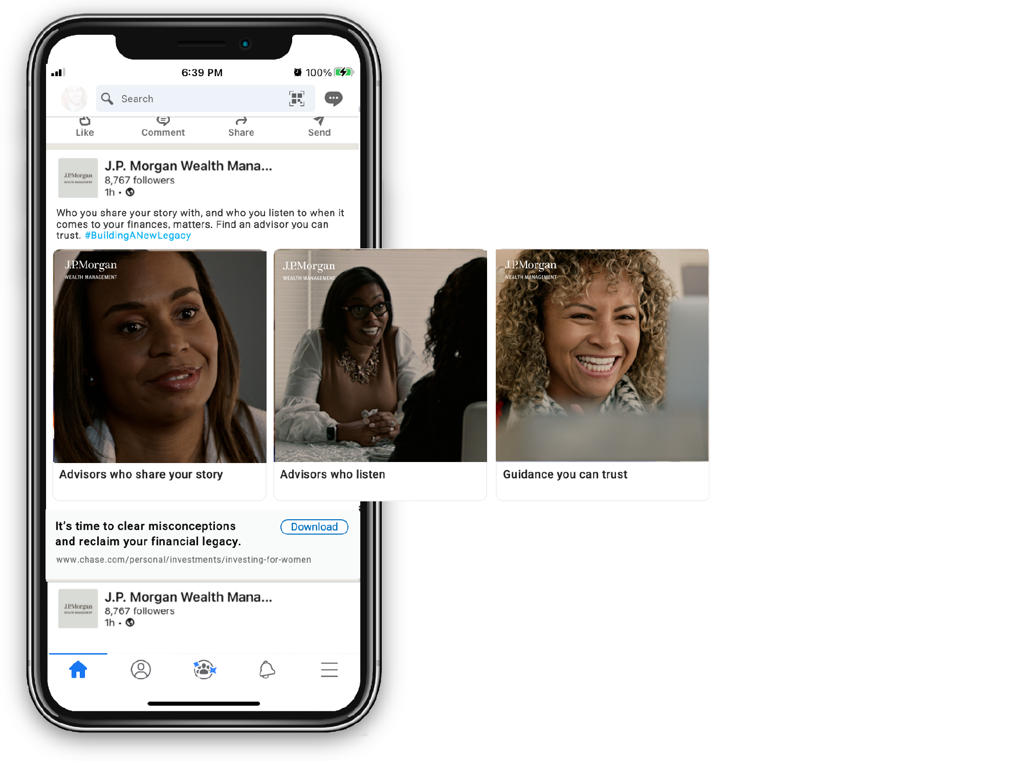 We also leveraged our online videos and footage stills to create a social campaign directing prospects to J.P. Morgan’s “Building a New Legacy” hub and newsletter, filled with custom resources for women embarking on their wealth building journey.