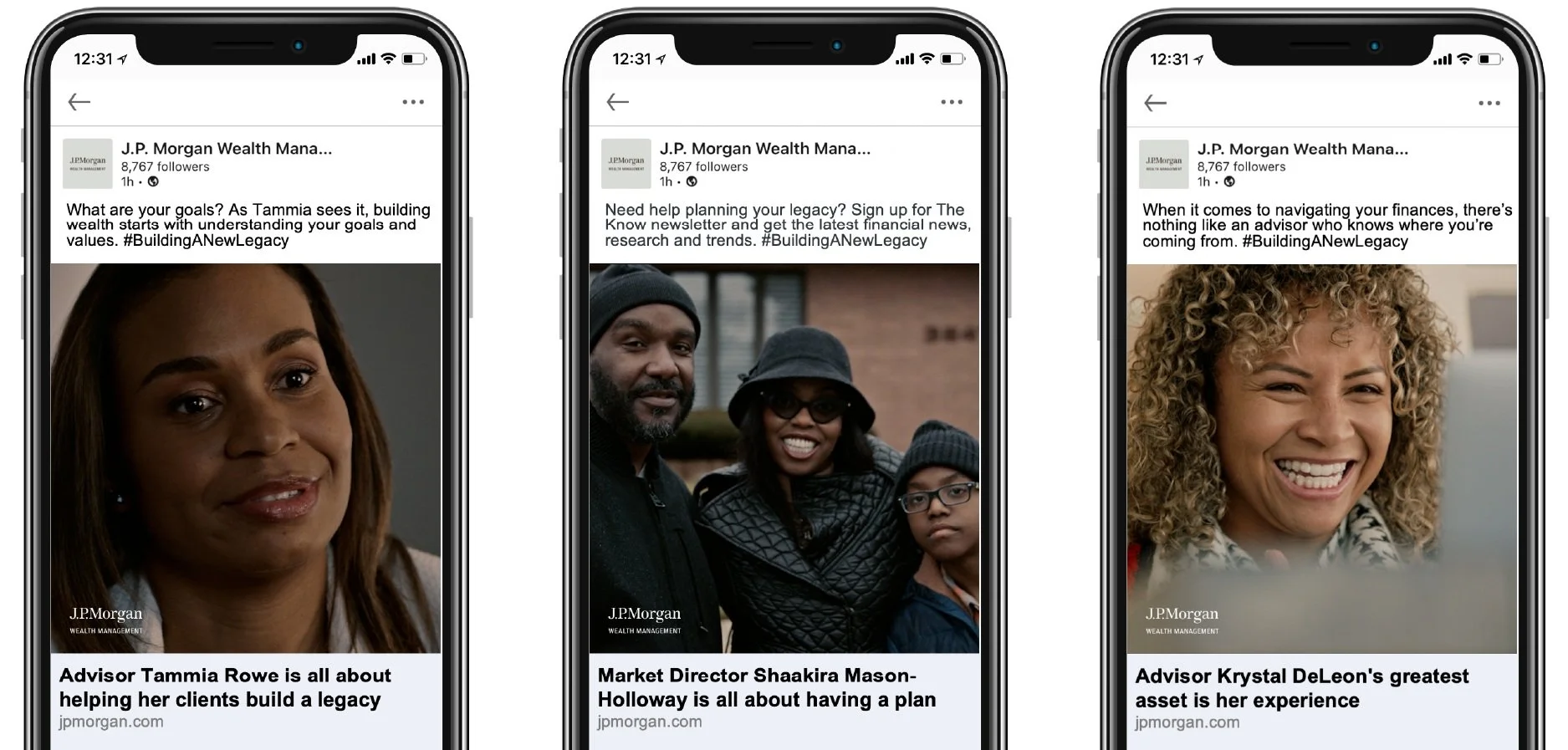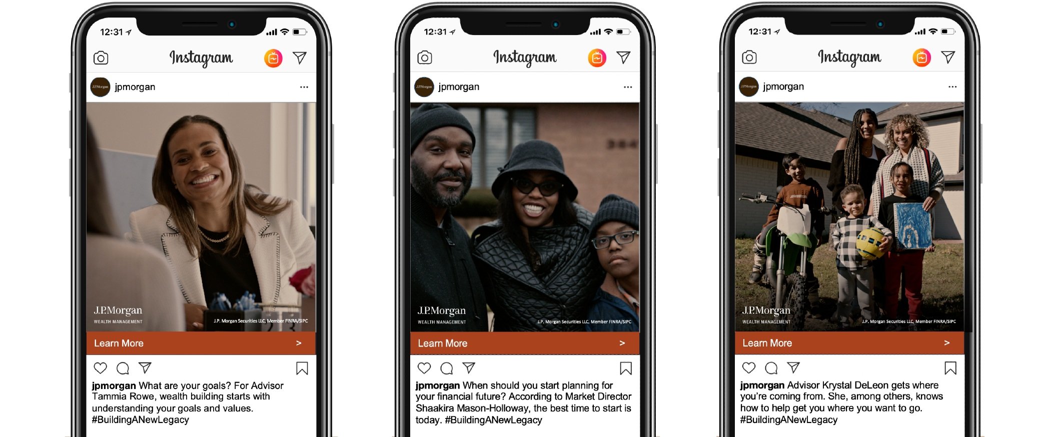 We created unique 9x16 15s versions for IG Reels and Stories (16x9 counterparts featured below), each with custom copy, inviting prospects to learn more on J.P. Morgan’s “Building a New Legacy” Hub.